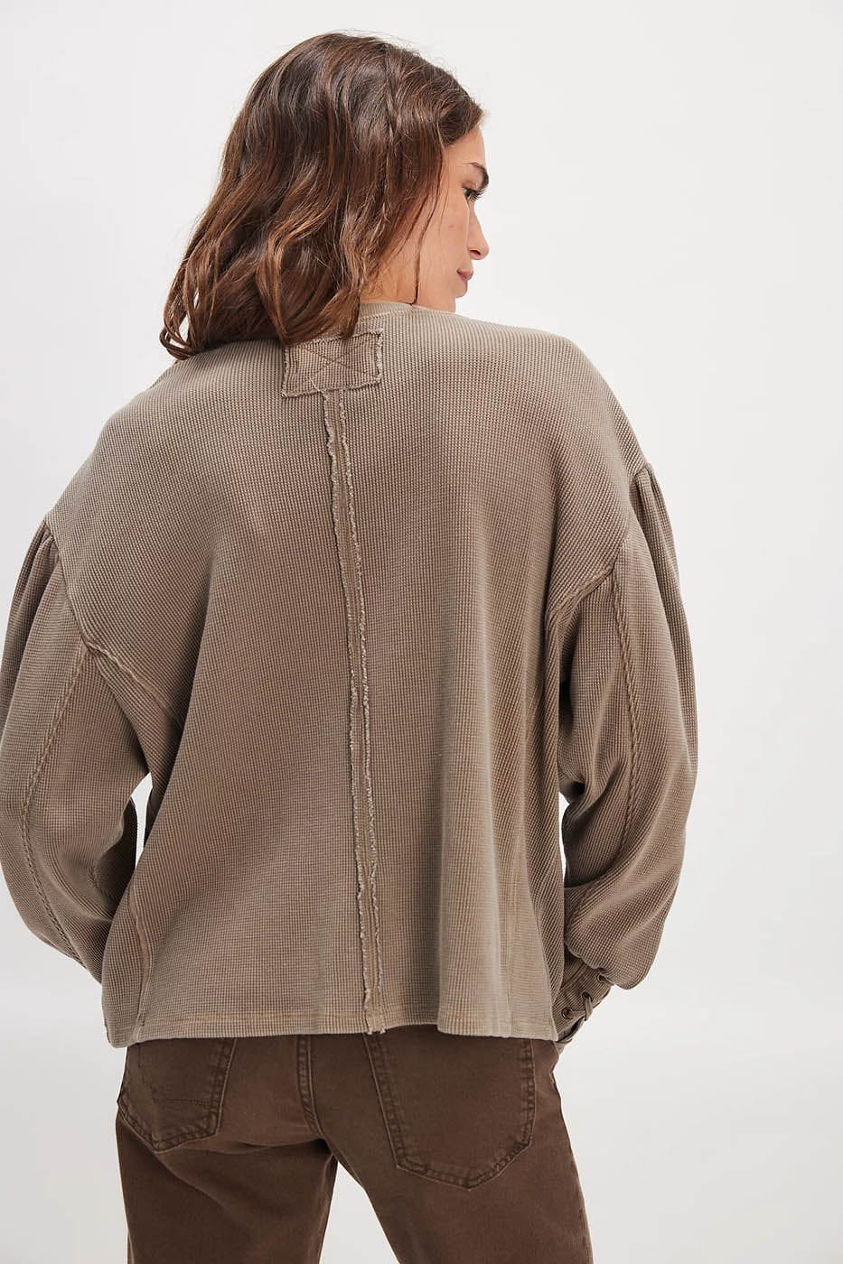 Lace-up details adorn the cuffs of this laidback long sleeve from We The Free, featured in a classic thermal fabrication with voluminous sleeves for added dimension.
