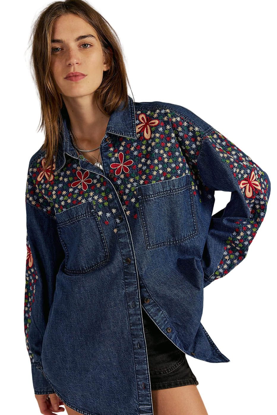 The perfect elevated basic, this denim top from our We The Free collection features vibrant embroidered motifs, a classic collared neckline, and a relaxed, button-down silhouette for a timeless touch.