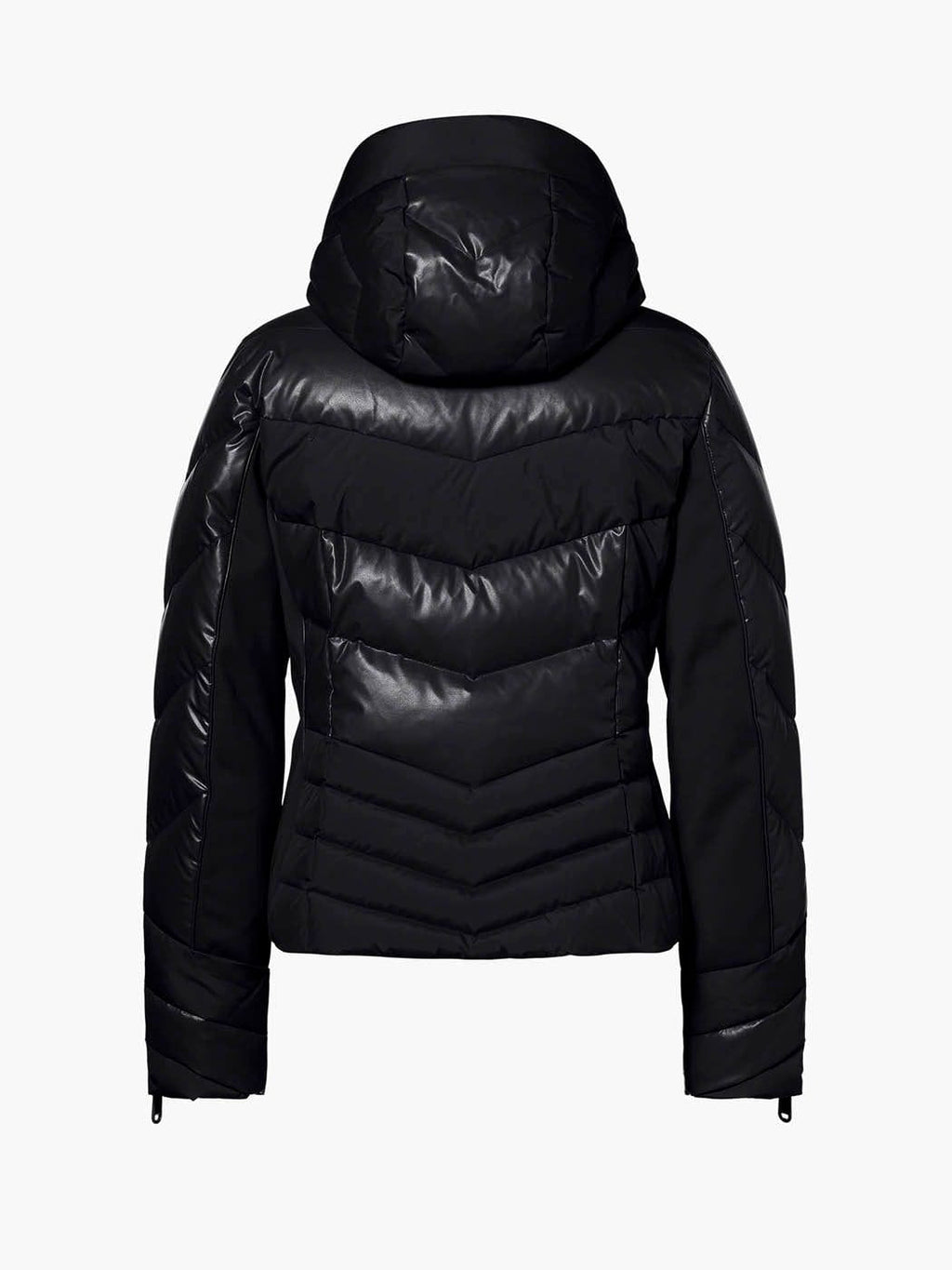 High-performance down insulation with modern design details. Cut in a regular fit, this quilted down jacket features a fixed hood, detachable snowcatcher, and knitted cuffs for warmth. Made from partly recycled outer shell fabric with imitation leather panels, it is lined with recycled polyester and finished with an anti-odor treatment.