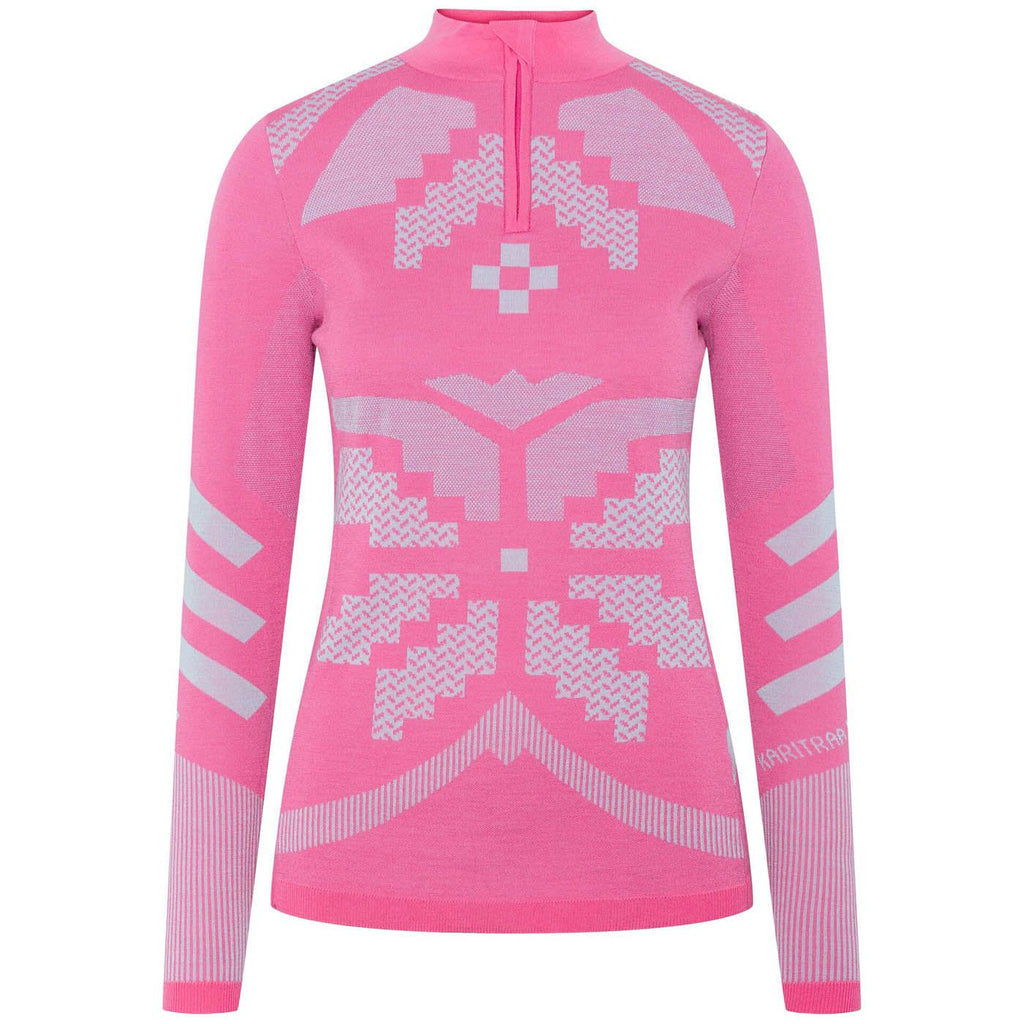 Meet the Kari Traa Faith Half Zip, a 100% Merino wool performance layer featuring our Female First body mapping technology. This semi-seamless top integrates supportive structure and ventilation where you need it: under arms, breast area, and back. With the eye-popping oversized Rose pattern, the Faith is for hard charging women who want to look as good as they perform.