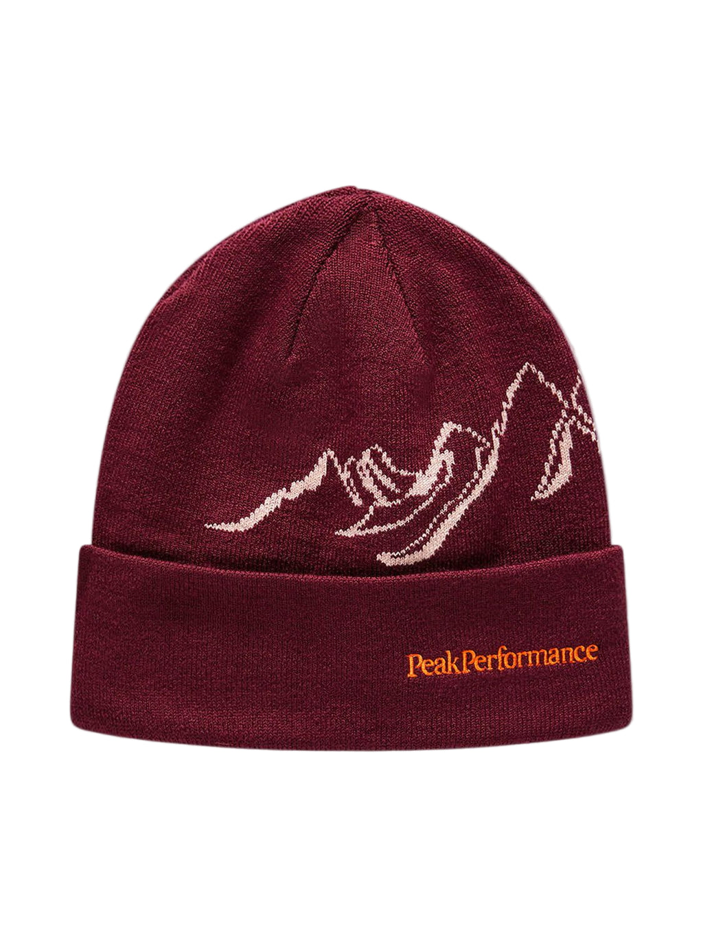 Soft and warm beanie knitted from a wool blend yarn with a mountain graphic.