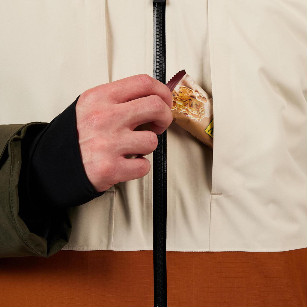 Details like an integrated powder skirt, zip vents and multiple pocket options are designed with skiing and riding in mind
